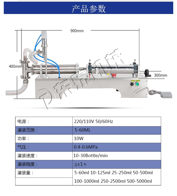小型液體定量灌裝機,通過氣缸帶動一個活塞來抽取和打出物料,用單項閥控制物料流向,小型液體定量灌裝機用磁簧開關控制氣缸的行程,即可調節灌裝量。