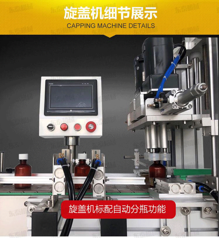 4、旋蓋機可適用于多種瓶型,旋蓋輪達到旋蓋時間旋緊蓋子后,自動停止,保護蓋子和瓶子,以免損傷。