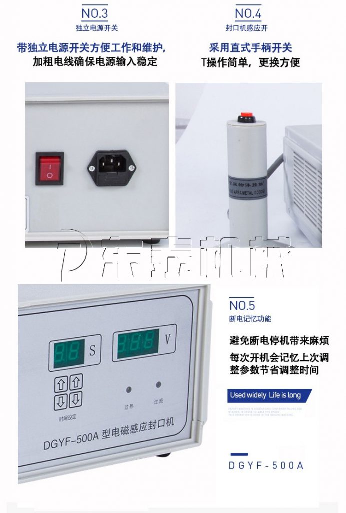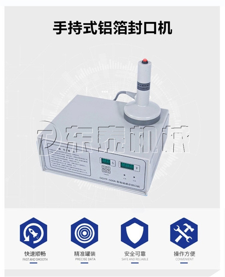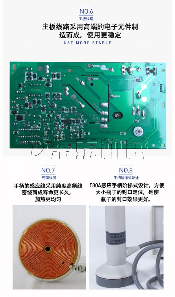 小型半自動鋁箔封口機采用國外先進線路,選用日本最新模塊化功率器件,較于一般電子感應加熱器更省電,熱效率達到90%以上,瞬時加熱速度為后者的20-30倍,因此不僅適用于熱封性能較好的聚乙烯、聚丙烯材質的瓶體,而且對熱封性能較差的聚酯瓶、玻璃瓶也有極好的封口效果。